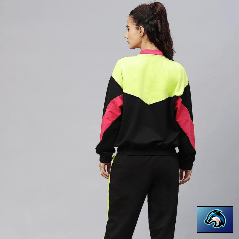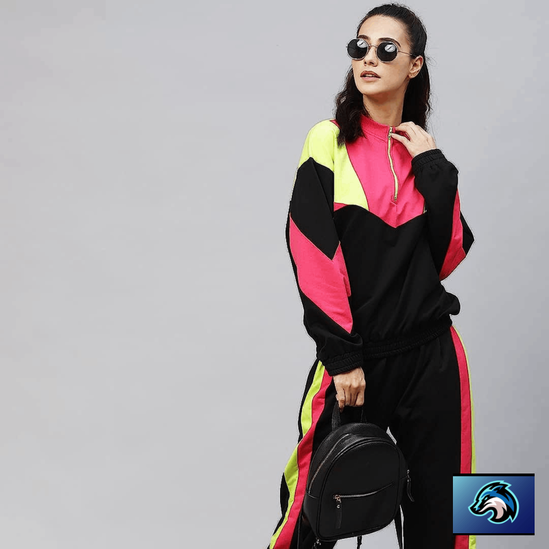 Traje de pista de color negro y rosa