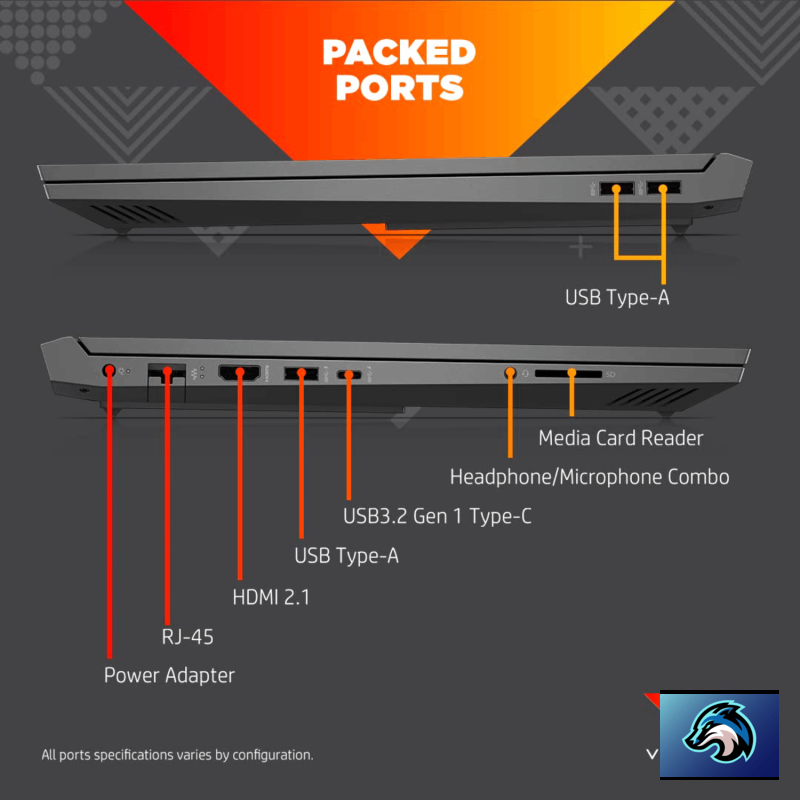 • Ports: 1 SuperSpeed USB Type-C 5Gbps signaling rate(DisplayPort 1.4, HP Sleep and Charge), 1 SuperSpeed USB Type-A 5Gbps signaling rate, 1 SuperSpeed USB Type-A 5Gbps signaling rate, 1 RJ-45, 1 headphone/microphone combo, 1 AC smart pin, 1 HDMI 2.1