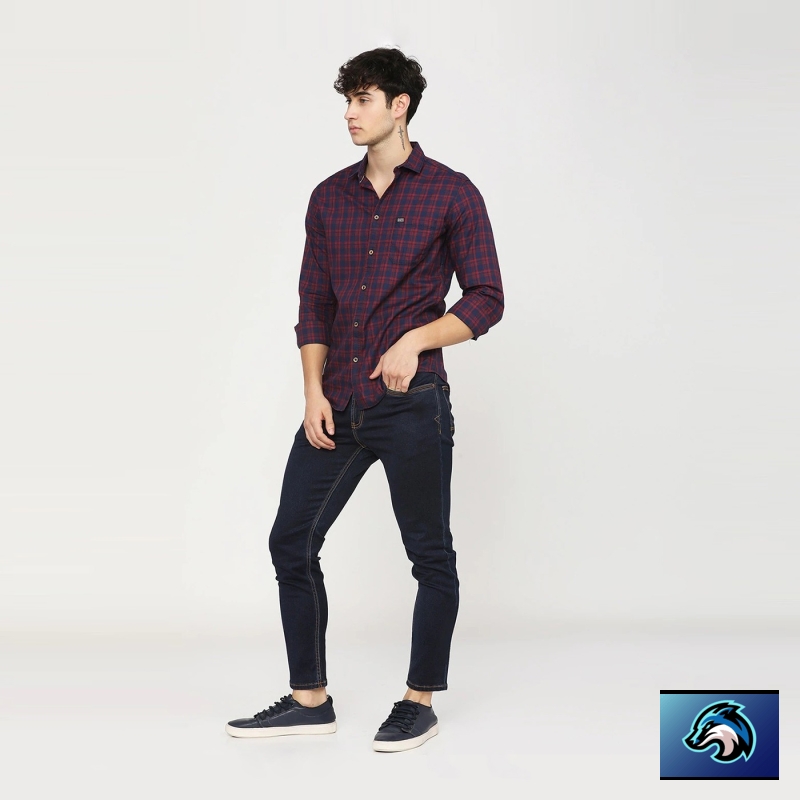 • Maroon and Navy Blue checked casual shirt, has a spread collar, long sleeves, button placket, curved hem, and 1 patch pocket.