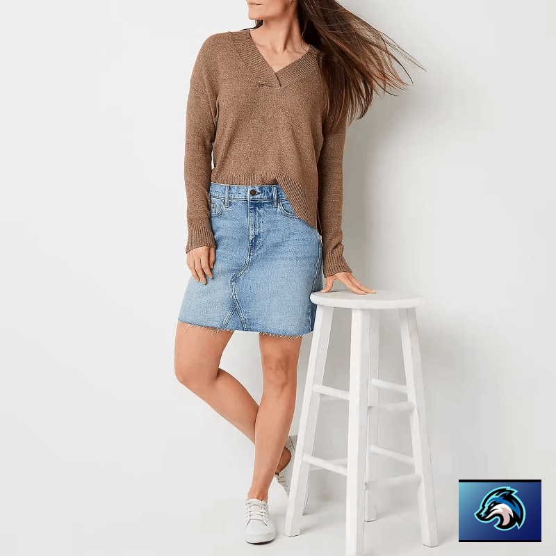 women's high-rise denim mini skirt with a bit of stretch so you can move throughout your day in comfort and features a classic button-zip fly, belt loops, 5-pocket tailoring, and distressed details for an on-trend appeal.