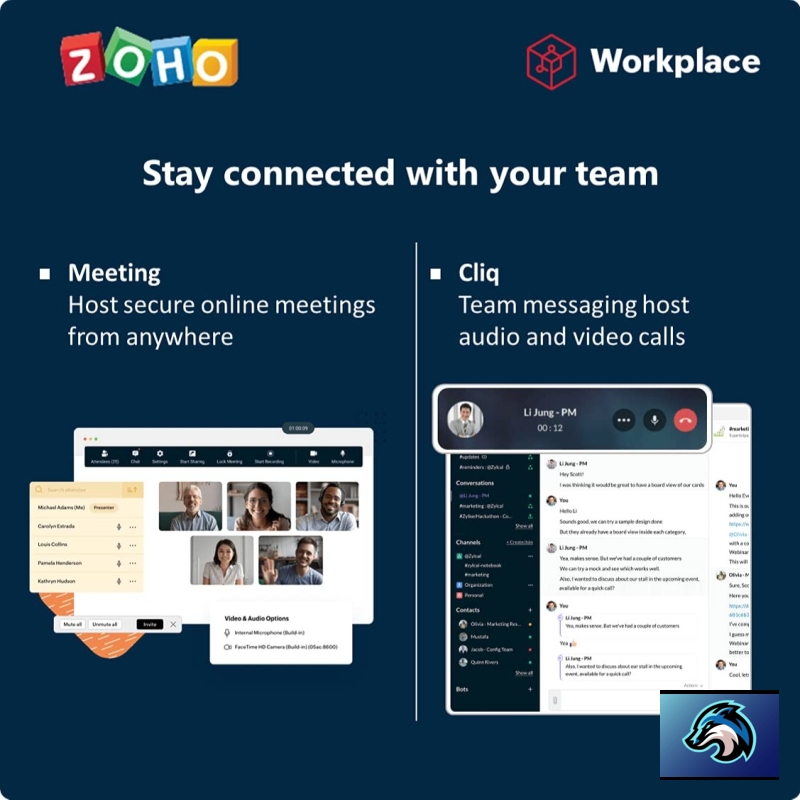 • Connect and collaborate with your team using online meetings, Email, Cliq. Securely create, store and manage files with Zoho Workplace, a better priced solution for your business