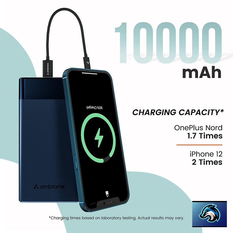 10000 مللي أمبير في الساعة - ليثيوم بوليمر سعة 10000 مللي أمبير تسمح لك بشحن أجهزتك بكفاءة عدة مرات. يمكنه شحن iPhone 12 - 2 مرات ، و OnePlus Nord - 1.5 مرة.