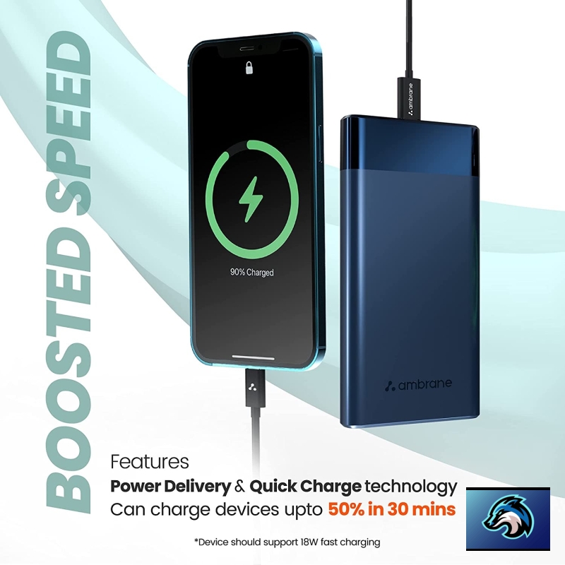 إدخال شحن سريع بقدرة 20 واط - يمكن شحن بنك الطاقة نفسه في غضون 4 إلى 5 ساعات لأنه يحتوي على تقنية توصيل الطاقة التي تدعم إدخال الشحن السريع بقدرة 20 وات عبر منفذ من النوع C.
