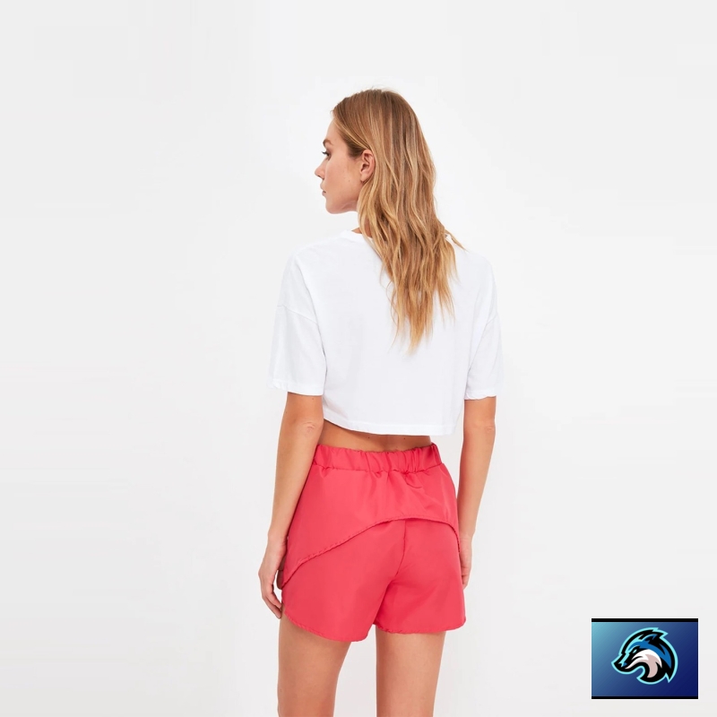 شورت وردي متوسط الارتفاع ، مع حزام خصر مطاطي.