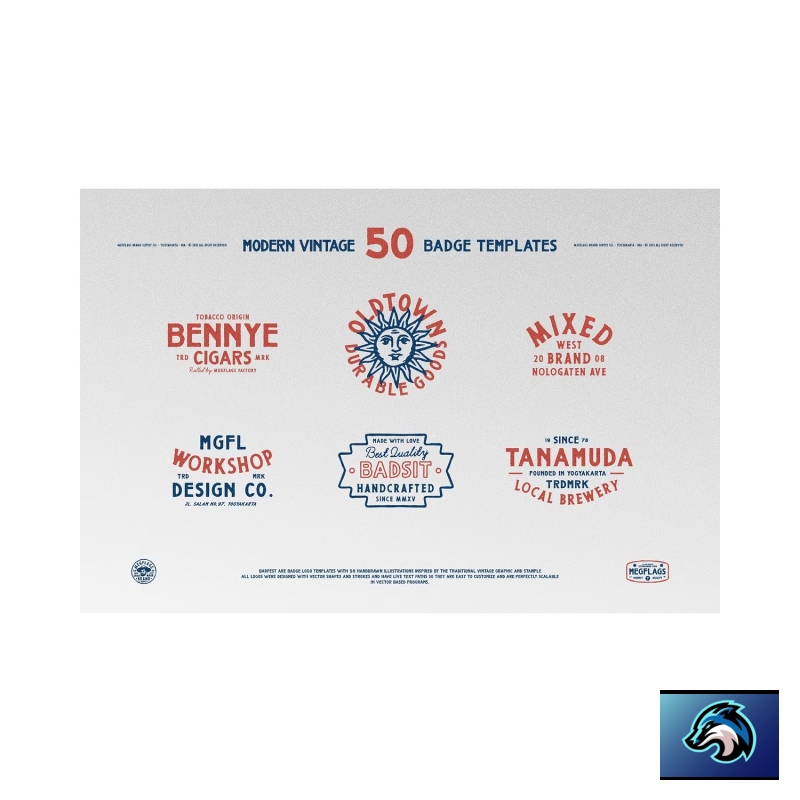 Badfest son plantillas de logotipos de insignias con 50 ilustraciones dibujadas a mano inspiradas en el gráfico y el sello vintage tradicional. Todos los logotipos fueron diseñados con formas vectoriales y trazos y tienen rutas de texto en vivo para que sean fáciles de personalizar y sean perfectamente escalables en programas basados en vectores.