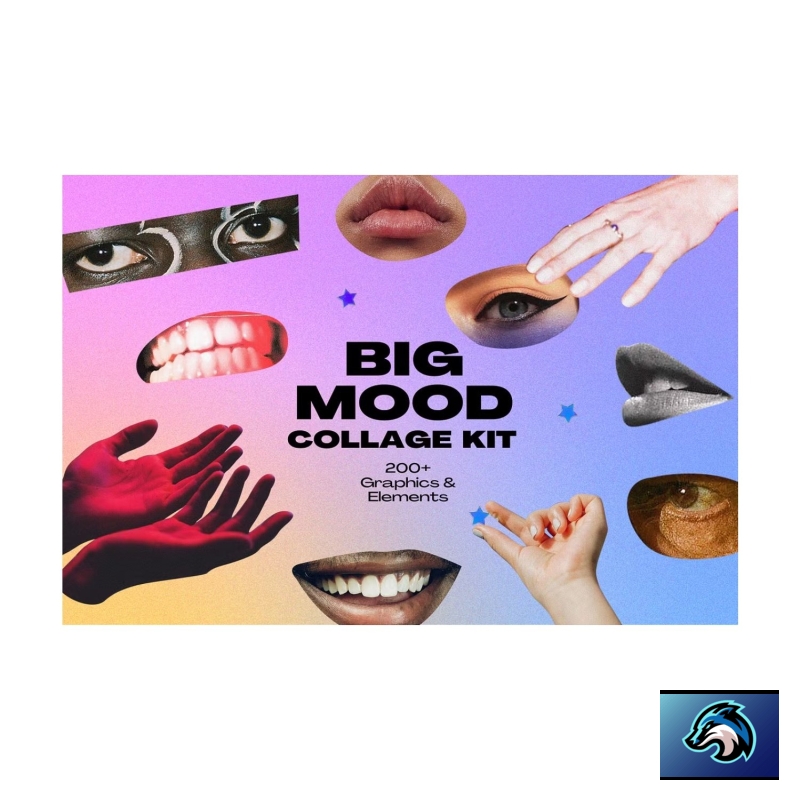 Big Mood collage kit features more than 200 cut-outs of Hands, Eyes, and Mouth. These can be used to add bold extra flavor to a variety of designs, art, and merchandise. Also includes custom hand-made collage elements like paint brush strokes and colorful paper scraps.
