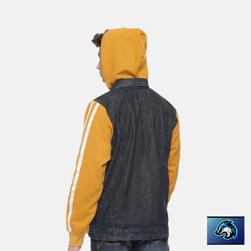 Men Charcoal Mustard Washed Colourblocked Windcheater Denim Jacket