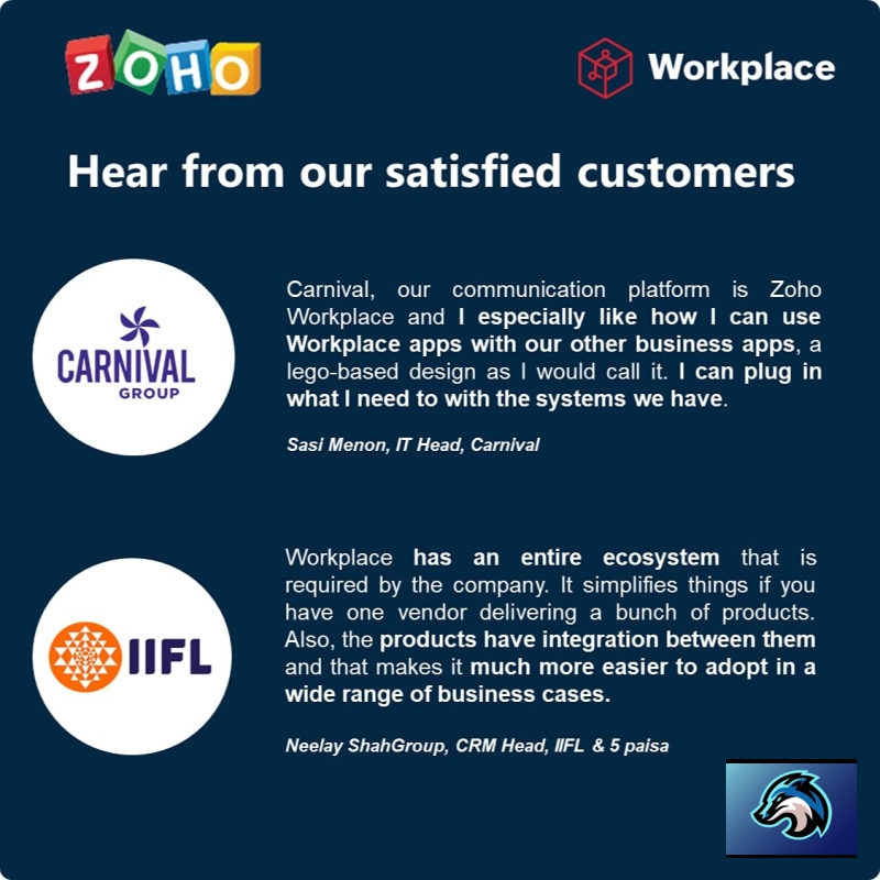 • Connect and collaborate with your team using online meetings, Email, Cliq. Securely create, store and manage files with Zoho Workplace, a better priced solution for your business